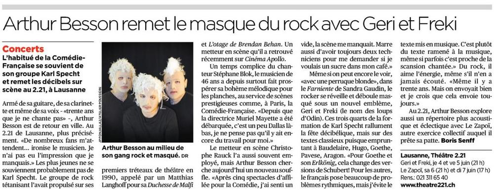 Après une dizaine d’années passées essentiellement en France pour des créations et des tournées théâtrales (M. Langhoff, C. Rauck, M. Mayette…) Arthur Besson vous propose de découvrir, sur une semaine et quatre concerts, ses deux nouvelles créations musicales :