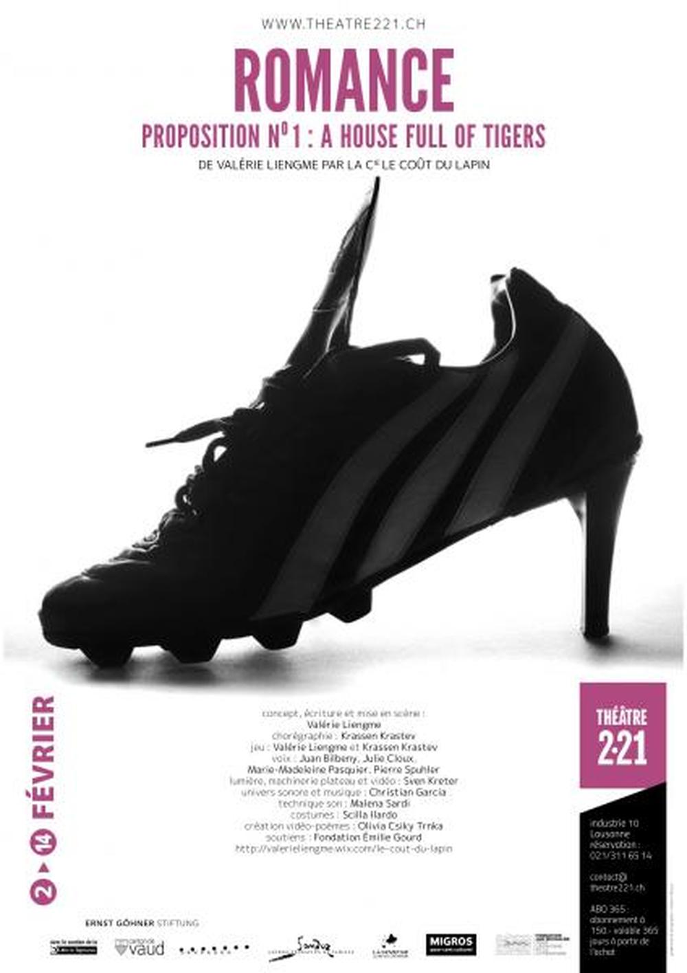 Un homme et une femme, ou une femme et un homme c’est selon, se retrouvent dans un lieu défini comme quelconque. Ils s’y construisent un petit nid, ils s’aiment, se confrontent, se racontent, s’inventent de nouvelles identités et de nouveaux rapports. Ils tentent de se libérer du carcan social (représenté par une radio) qui les assignent à des rôles sexués, définis comme immuables et naturels. Ils s’amusent avec les clichés, expérimentent diverses relations amoureuses, cherchent à multiplier les points de vue et les prises de positions jusqu’à l’absurde. Peu à peu, de nouveaux personnages imaginaires s’invitent dans leur théâtre intime. Et parce qu’à travers leur fantaisie, ils se sont imaginés autres, ils réussissent à remettre en question l’image figée dans laquelle ils étaient emprisonnés. C’est une invitation ludique dans un monde plein de musique, de danse et de bruits que nous propose la Cie Le Coût du Lapin à travers sa création originale Romance.
