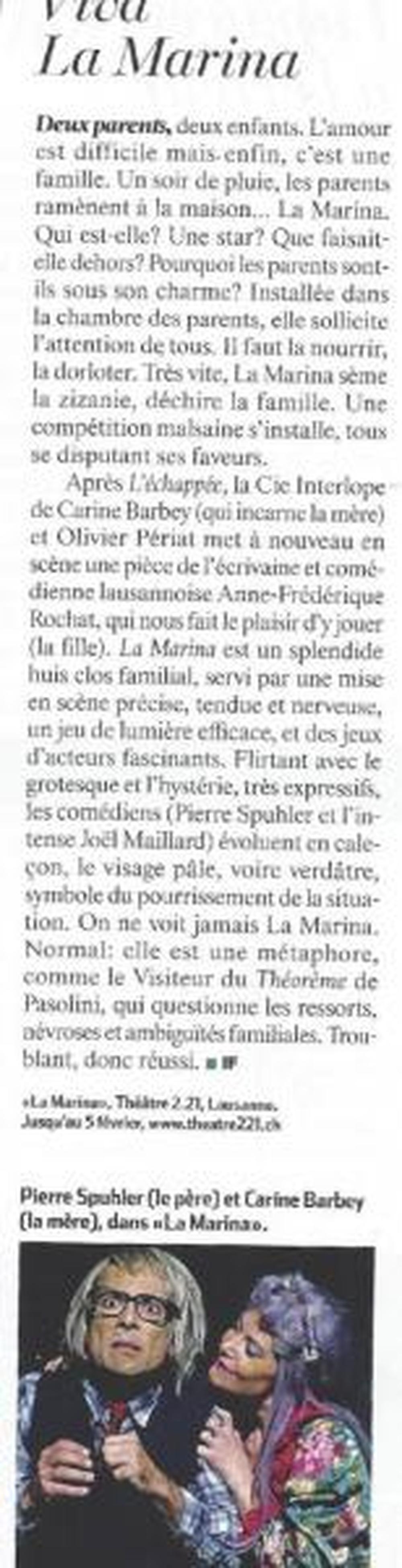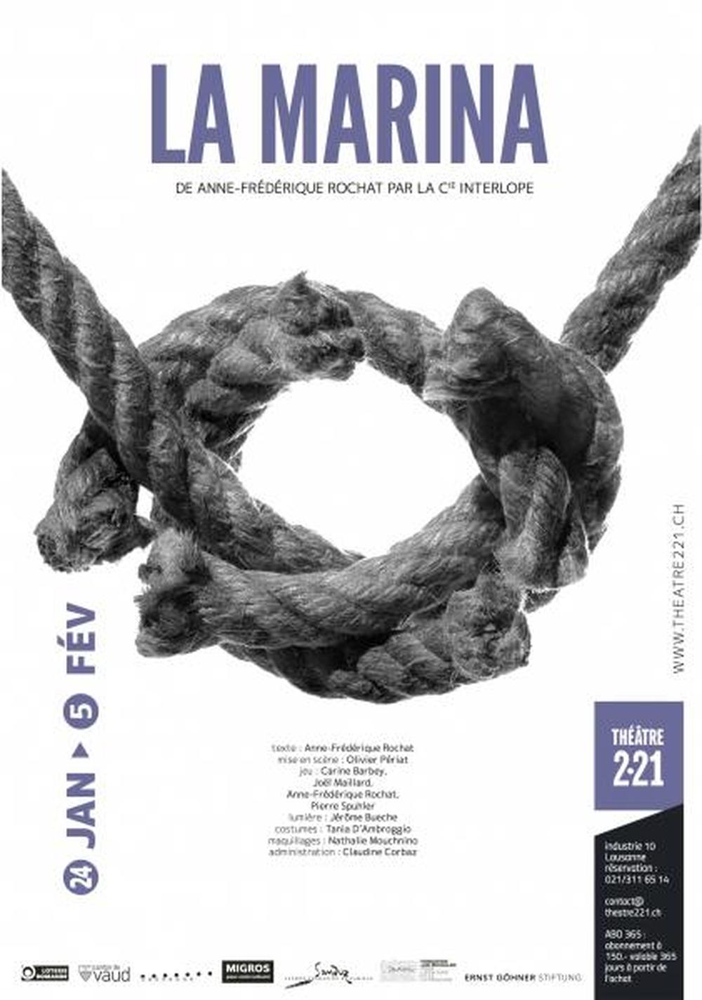 « Ce qui me plaît énormément dans l’écriture de Anne Frédérique Rochat, c’est qu’elle ouvre des portes à l’imaginaire. En partant de situations relativement simples, ses textes donnent un véritable terreau au jeu de l’acteur. Au théâtre, c’est la possibilité de tordre la réalité pour la rendre plus lisible, plus visible. »Un besoin non nécessaire mais devenu indispensable… LA MARINA sera ! à l’image du travail de la compagnie, basé sur l’expérience et l’amitié.