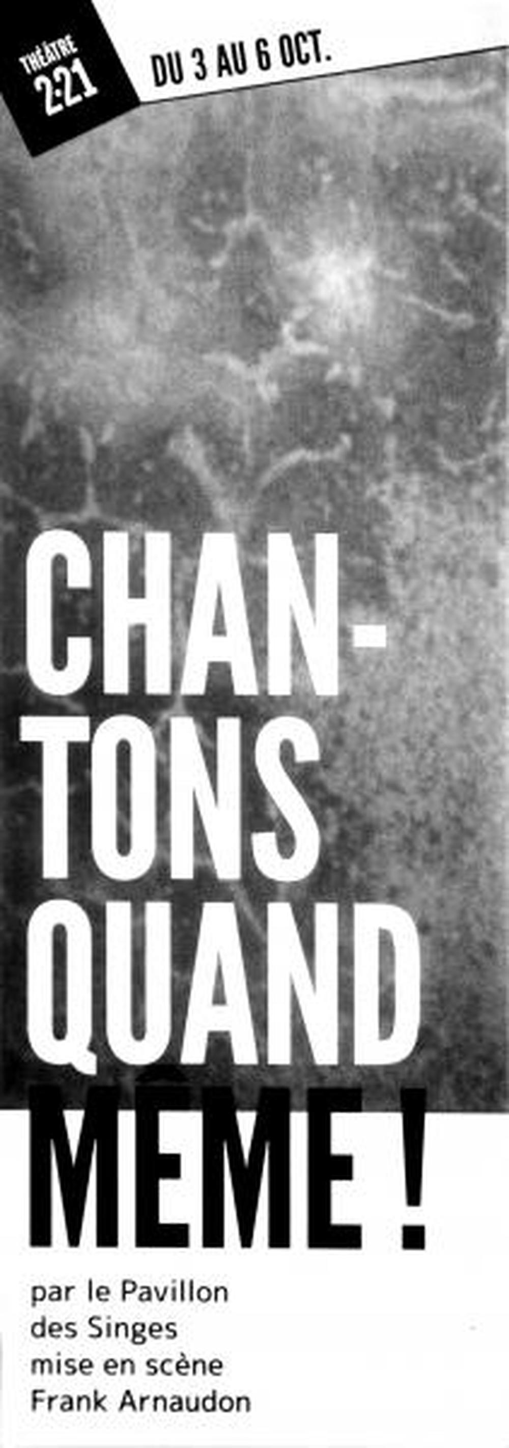 Paris. Juin 1 940. La guerre fait rage depuis neuf mois. A Vichy, le Maréchal Pétain s’apprête à capituler devant Hitler. La France est coupée en deux. Malgré eux ou par choix, les Françaises et les Français se préparent à la collaboration. Sur les ondes de la TSF, Maurice Chevalier chante Paris sera toujours Paris.Bien que la vie quotidienne soit rythmée par les difficultés et les restrictions de tous ordres, les salles de spectacles ne désemplissent pas. Les artistes, et les chanteurs en particulier, apportent aux Parisiens ce petit réconfort qui leur permet d’oublier un peu la tragédie qu’ils traversent, le temps d’une soirée.C’est une partie du répertoire de cette période troublée que Le Pavillon des Singes souhaite présenter au public dans CHANTONS QUAND MÊME!Les spectateurs seront donc conviés à un périple à travers Paris occupé, à la rencontre des habitants, de leurs conditions de vie et de leurs aspirations. Mais en lieu et place de commentaires historiques, les chansons choisies inviteront le public à découvrir les sensibilités exacerbées de cette époque.Raconter, grâce à un choix de chansons de cette période, la vie quotidienne des Parisiens pendant l’Occupation, voilà l'ambition de CHANTONS QUAND MÊME!