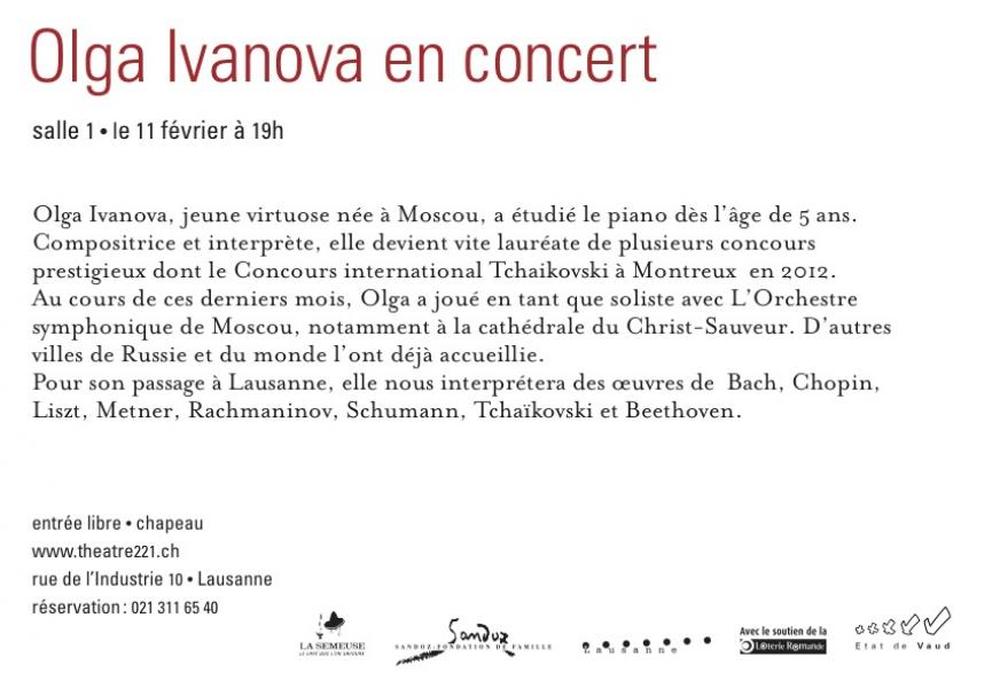 Olga Ivanova, jeune virtuose née à Moscou a étudié le piano dès l’âge de 5 ans. Olga devient vite lauréate de concours nationaux puis de concours internationaux dont le prestigieux Concours international Tchaikovski (Montreux 2012).