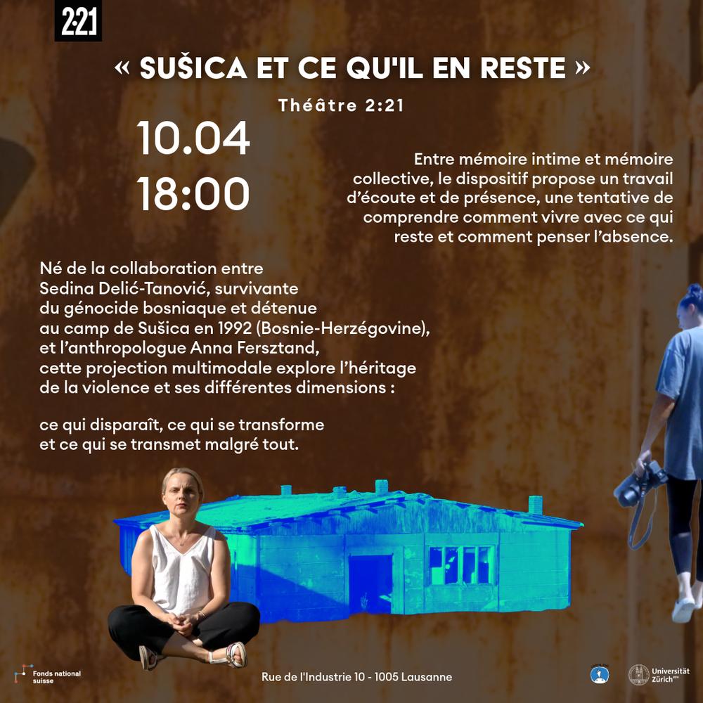 Né de la collaboration entre Sedina Delić-Tanović, survivante du génocide bosniaque et détenue au camp de Sušica en 1992 (Bosnie-Herzégovine), et l’anthropologue Anna Fersztand, ce documentaire explore l’héritage de la violence : ce qui disparaît, ce qui se transforme et ce qui se transmet malgré tout. Entre mémoire intime et mémoire collective, le film propose un travail d’écoute et de présence, une tentative de comprendre comment vivre avec ce qui reste et comment habiter l’absence. Ce projet de recherche est financé par le fonds national suisse.